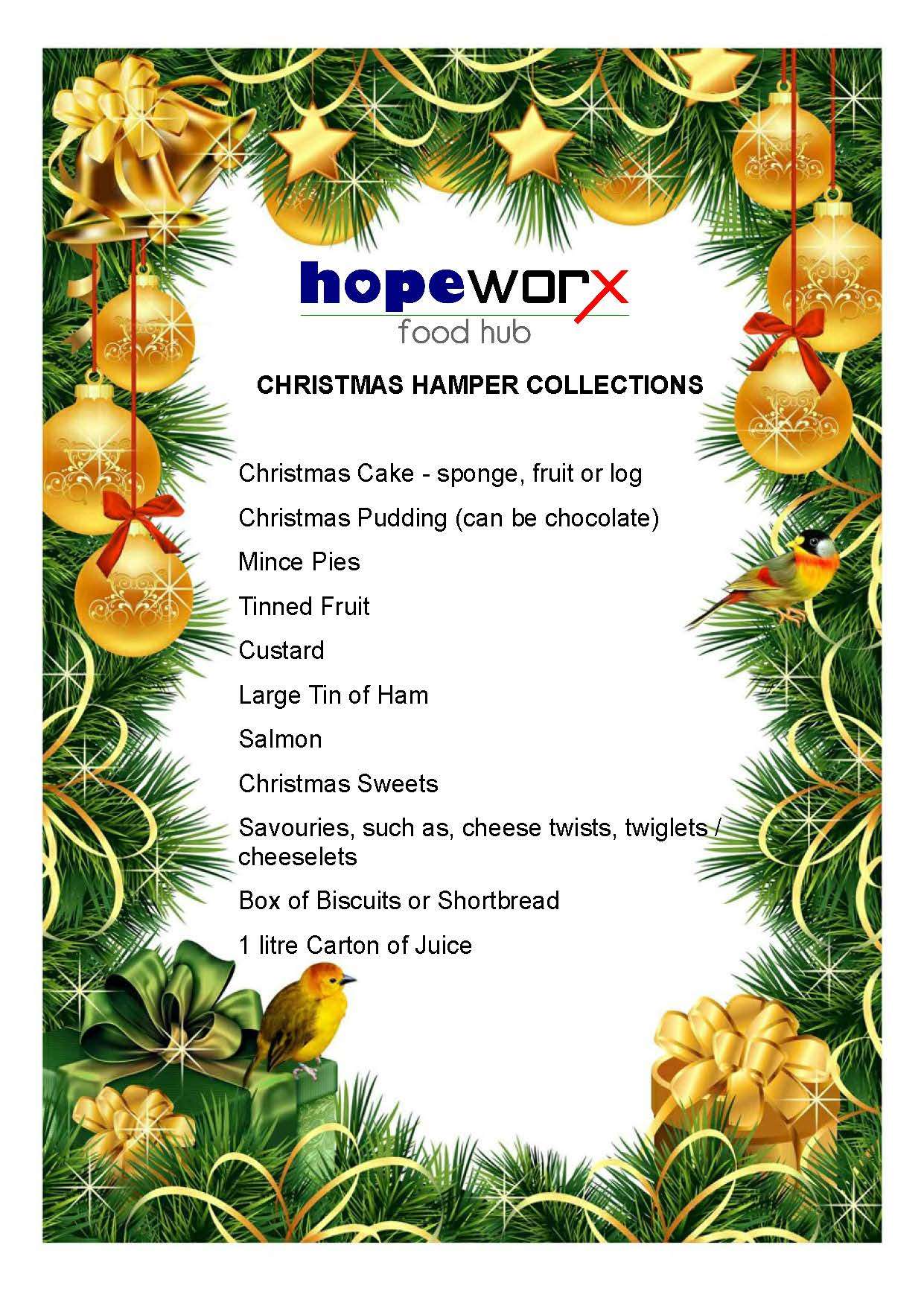“Hopeworx provides Christmas hampers to vulnerable families. If you would like to make a donation you can take any of the good listed below to the Hopeworx Re-Use Centre, 33 Brook Rd, Rayleigh, SS6 7XJ or bring them in to school, marked “for the attention of Dawn Pearman”.